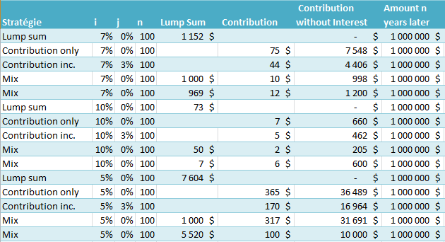 From the above table, we can compare the lump sum strategy to a contribution strategy. The Lump Sum requires 11%/15%/21% less contribution at 10%/7%/5% interest rate. However, the lump sum is 10x/15x/21x more than the yearly contribution strategy. If you are able, it makes sense to fund early and have lower contribution in the future. I haven't read anyone doing it except when in retirement. For a person to be able to act on having lower contribution in the future, we need to have a well though out plan, to be able to live frugally at the beginning and be able to live expensively at the end. It is a rare combination.
